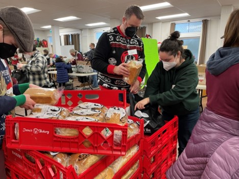 The Elves showed up first, followed by guitarist Ian Johnston and violinist Marjorie Cullerne, who have so joyously entertained us in the past. With Covid restrictions gone, High Point could accommodate more volunteers. Almost 50 eager volunteers listened as Elf Dan laid out the evening’s work plan. Then, to Marjorie and Ian’s Christmas carols and show tunes, everyone dove into prepping supplies for Saturday’s hamper stuffing.