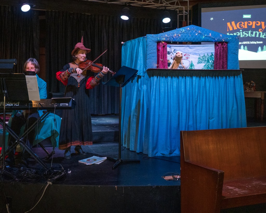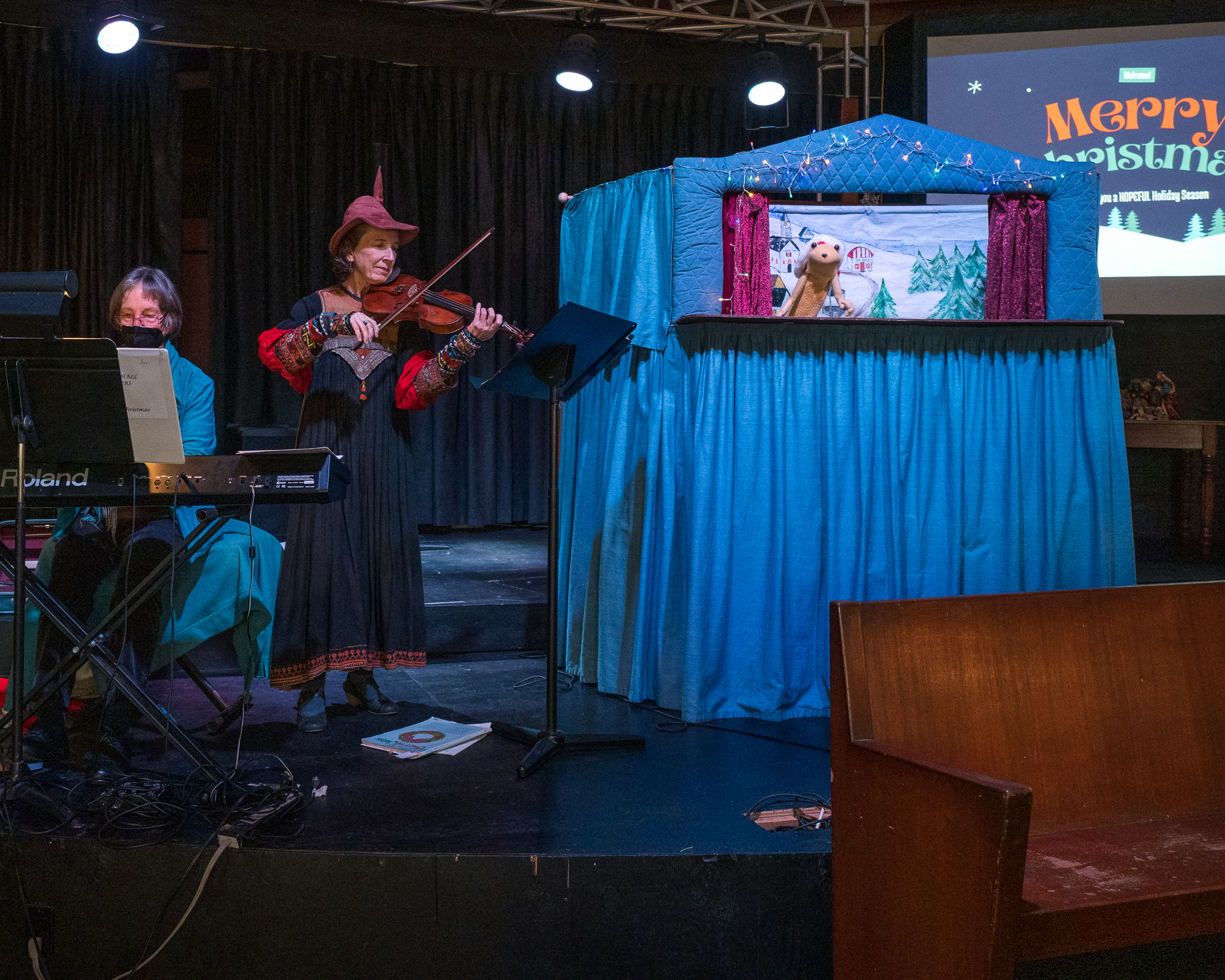 A young person adds the final food item to a hamperTireless Marjorie Cullerne was now upstairs with her violin, joined by Mary Ann Unrau on keyboards and Larissa Schumuk on flute. There were cookies, coffee and hot chocolate for people as they waited and our dear puppeteer Tim Gosley once again delighted kids, and kids at heart, with his beautiful puppet theatre and cheeky hand puppets.